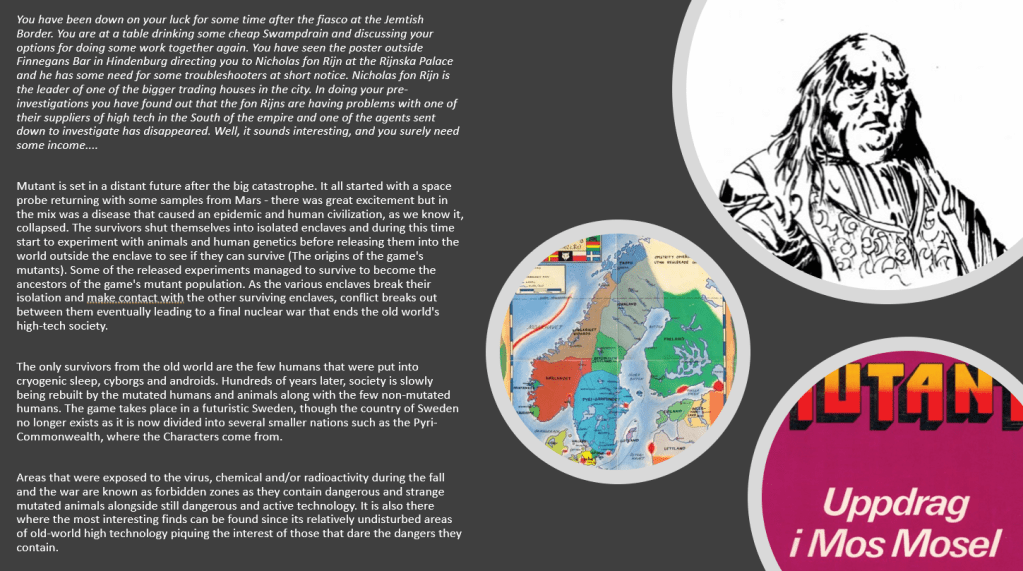 I was thinking about what I could offer that was a little bit unique and from back in the day, so I flipped through the introductory scenario for the 1984 Mutant book – Uppdrag i Mos Mosel (Mission in Mos Mosel) and realised that it is actually a workable scenario divided into two parts – an initial detective type of situation where the characters are trying to find out what is going on in the village and a second part where they find their way to the lair of the beast – so to speak (that contains it own little quirks with the possibility of forming an unexpected alliance and enough potential radiation damage to allow the characters to survive the scenario but still die after it – life is not fair, not even if you are a hero).